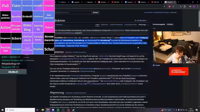 11:36:52Die Gruppe startet ein Wikipedia-Bingo, bei dem sie verschiedene, teils willkürliche Themen wie 'Faker', 'Mondlandung', 'Gronkh' oder 'Tatort' auf dem Portal finden müssen. Sie navigieren durch die Links, diskutieren die Zugänglichkeit der Themen und feuern sich gegenseitig an. Es entsteht eine wettbewerbsorientierte Atmosphäre, bei der sie versuchen, möglichst viele Begriffe von ihrer Liste zu finden, bevor der andere Spieler zurückkommt.