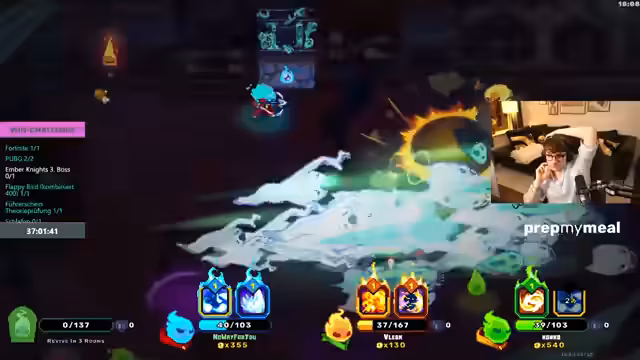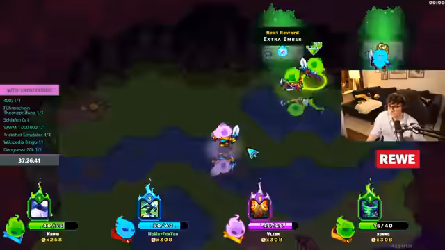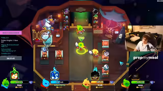 10:48:04Nach einem kurzen Überblick über Twitch-Werbedeals und dessen Einfluss auf das Einkommen kehren die Teilnehmer zu Ember Knights zurück, einem Koop-Spiel. Sie erhalten eine Einführung in die grundlegenden Steuerungen und Spielmechaniken, darunter Raumreinigung, das Laden von Fähigkeiten durch Angriffe und das Sammeln von Ember als Währung. Sie starten einen ersten Lauf im Hard Mode, evaluieren frühe Verstärkungen wie den Schadens-Typ der Fähigkeiten, und diskutieren Strategien für den Bosskampf, wobei sie aufgrund der Lernkurve mehrere Versuche benötigen.