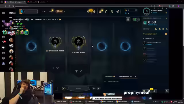 00:57:09Der Streamer startet ein neues League of Legends-Spiel auf dem Server in der Türkei. Er spielt den Champion Rakan als Support und analysiert das gegnerische Team, das AP-heavy aufgestellt ist. Er erwähnt, dass sein Pick Rakan ein guter Follow-up auf die zuvor gespielten Champions Diana und Yone ist, obwohl er im Spielverlauf Schwierigkeiten mit dem Champion hat.