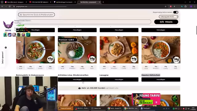 00:43:52Nach dem ersten Spiel wird das Thema gewechselt. Der Streamer bewirbt das Essen von Prep My Meal, einem Partner des Kanals. Er empfiehlt verschiedene herzhaften Gerichte wie die Hähnchen-Kokos-Bowl und die Süßkartoffel-Bowl, die er sehr praktisch und lecker findet. Er erklärt, dass die Mahlzeiten gut sättigen und mit einem Rabattcode bestellt werden können.