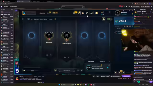 08:49:11Nach einem Spiel zeigt der Streamer deutliche Frustration über den Verlauf und das Management der aktuellen League of Legends-Runde. Er findet, dass die Gegner, insbesondere ein Kha'Zix, unfaßbar stark sind, und kritisiert das Spiel seines Teammates Lucian scharf, dessen Fähigkeiten er als maximal Bronze oder Silver bezeichnet. Er fühlt sich im Spiel im Nachteil und macht sich Sorgen über den eigenen Status und die Möglichkeiten, das Spiel noch zu drehen.