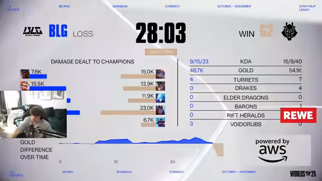 02:47:12G2 konnte im Mid-Game durch die Eroberung des Heralds und eines Dragons das Spiel wieder ins Gleichgewicht bringen. Der Nexus-Turm auf Top fiel, doch der Herald als Druckmittel wurde für den Dragon-Fight genutzt. Der entscheidende Moment kam, als BLG einen fehlerhaften Teamfight startete und dabei fast alle wichtigen Summoner-Skills verlor. G2 nutzte diese Gelegenheit zur Maximal, gewann den Fight und tötete den Baron Nashor, was ihnen einen entscheidenden Vorteil verschaffte. Mit diesem Buff waren sie in der Lage, sofort Elder Dragon zu jagen und das Spiel zu gewinnen.