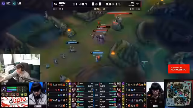 01:40:03Das Spiel beginnt, und der Streamer analysiert die ersten Minuten im Detail. Das Jungle-Matchup zwischen Ona von T1 und Canyon von Gen.G wird als entscheidend identifiziert. Gen.G zeigt starke Präsenz und Objektiv-Kontrolle, indem sie den ersten Dragon und den Herald kontrolliert. Der Streamer lobt das nahezu fehlerfreie Gameplay von Gen.G und stellt fest, dass T1 in allen kleinen Szenarien unterlegen ist, was zu einem frühen Goldvorsprung führt.