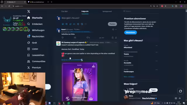 09:44:03Das aktuelle Spiel wird als überwiegend gut bewertet, trotz einiger Fehler zum Ende hin. Der Rangaufstieg von Platin 4 auf Platin 1 wird positiv hervorgehoben, auch wenn das Ziel Emerald knapp verfehlt wurde. Die Spieler sind sich bewusst, dass sie nur zwei Siege von Emerald entfernt waren und die Matchmaking-Probleme weiterhin bestehen. Es folgt eine technische Schwierigkeit, da der Streamer Probleme hat, sich mit dem Discord-Call zu verbinden. Die Diskussion wechselt zu den bevorstehenden Spielen und der Strategie, um weitere Siege zu erzielen und möglicherweise in der Rangliste aufzusteigen. Es wird über die Platzierung in der Liga und die Notwendigkeit von Siegen gesprochen, um die Position zu sichern und eventuell andere Teams zu überholen.