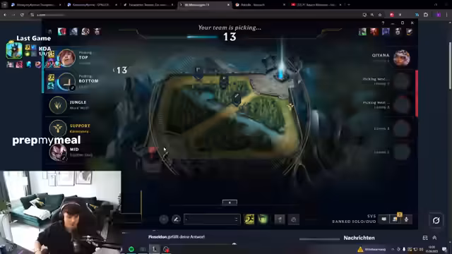 00:32:11Nach einem Spiel mit Rakan reflektiert der Streamer über die Win-Rate seiner Champions. Er stellt fest, dass sein Rakan, den er oft blind pickt, eine deutlich niedrigere Win-Rate (46%) hat als sein Alistar (63%), den er nur als gezielten Counterpick einsetzt. Er schlussfolgert, dass die Champion-Auswahl einen enormen Einfluss auf den Erfolg hat und dass es einen großen Unterschied macht, ob man einen Champion ausnotwendig pickt oder gezielt als Antwort auf den Gegner wählt.