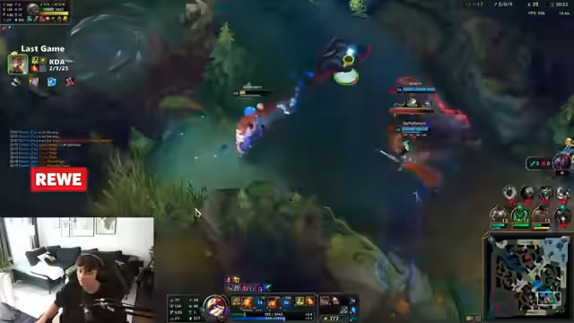 02:48:31Der Streamer befindet sich in einem entscheidenden Moment des Spiels, in dem er versucht, einen für das Team wichtigen Kill zu landen, um die stark aufkommende Tristana am Bot-Lane aufzuhalten. Er beschreibt sein eigenes Vorgehen als riskant, aber notwendig, und ist enttäuscht, als er den Kill nicht landen kann. Das Team gerät dadurch in eine schwierige Position. Gleichzeitig kommt es zu einem verbalen Streit im Chat mit einem Gegner, der nach dem Spiel eine Friend-Request schickt und den Streamer beleidigt. Der Streamer verteidigt sich, indem er die Kompetenz des Gegners infrage stellt und den Streit als Lächerlichkeit darstellt.