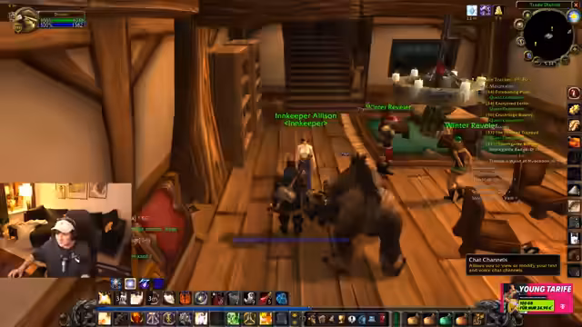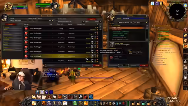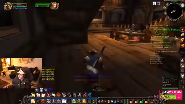 06:35:08Der Streamer besorgt 28 Shiny Red Apples für ein Event und kocht Jungle Stew, der starke Buffs (+8 Stamina/Spirit) liefert. Er erwähnt die Wichtigkeit von Kochen auf Hardcore-Servern für kleine Vorteile, die in Retail irrelevant wären. Es gibt Probleme, Refreshing Spring Water in der Taverne zu finden. Das Cooking-Level steigt auf 225, und überschüssige Portionen könnten verkauft werden.