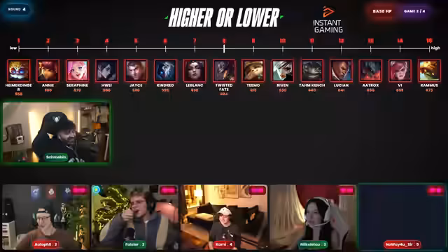 07:08:11Das Higher/Lower-Spiel startet mit Skin-Anzahlen. Phil beginnt mit Rammus (12 Skins), Teilnehmer raten Positionen von Champions wie Smolder, Nafiri und Amumu. Diskussionen über Skin-Strategien (neuere Champions haben weniger) und Fehlerraten dominieren. Später folgen Runden zu Basis-HP (z. B. Aatrox mit 675) und Item-Goldkosten (z. B. Rabadons, Abyssal Mask). Technische Issues und心理ische Taktiken (Fake News) erschweren das Spiel, bevor Release-Dates als letzte Kategorie angekündigt werden.