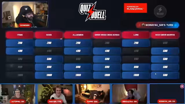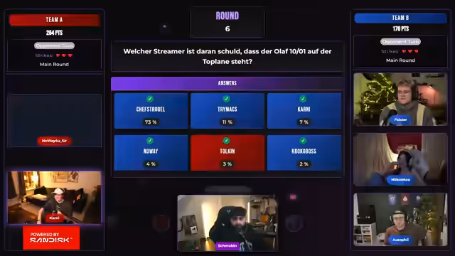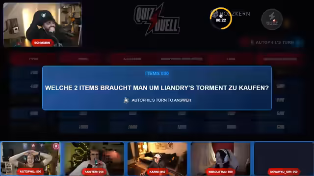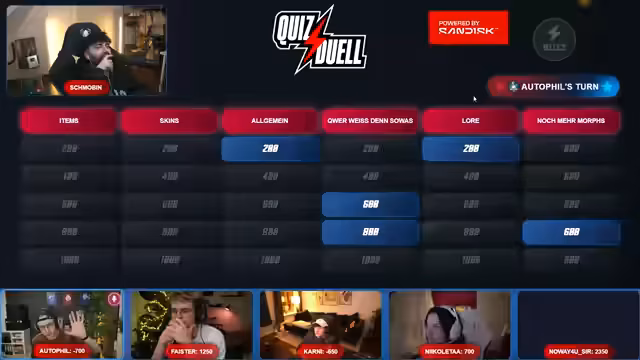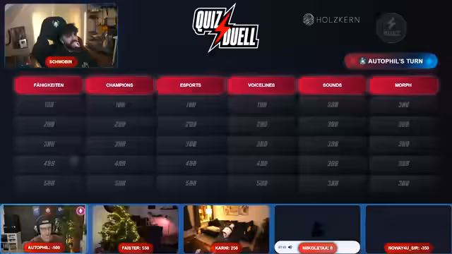 08:39:07Der Stream startet mit einem interaktiven Quiz, bei dem die Teilnehmer Fragen zu League of Legends beantworten. Es geht um Champion-Fähigkeiten und Lore, wie die Suche nach dem korrekten Namen einer Maske. Spieler wie Phil und Feister diskutieren lebhaft über die Antworten, während Punkte vergeben werden. Debatten entstehen über die Regeln, etwa ob bestimmte Antworten ausreichen oder ob Minuspunkte bei falschen Angaben fällig sind. Die Runde endet mit einer Diskussion über Items und Skins, wobei Kani mit präzisen Antworten punktet.