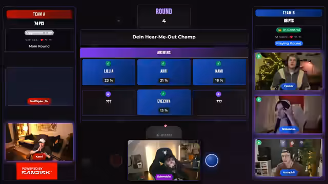 08:02:17Nach einer kurzen Pause startet die nächste Runde mit E-Sports-Fragen. Es geht um Teams, die 2013 und 2015 World Championships gewannen, und Pick-Ban-Statistiken bei Weltmeisterschaften. Voice-Line-Fragen werden beantwortet, darunter Zitate von Champions wie Camille und Jax. Die Punkteverteilung wird diskutiert, und die Teilnehmer versuchen, durch Risikobereitschaft in schwierigen Kategorien Punkte aufzuholen. Ein besonderer Fokus liegt auf der Identifikation von Streamern anhand von Champion-Features.