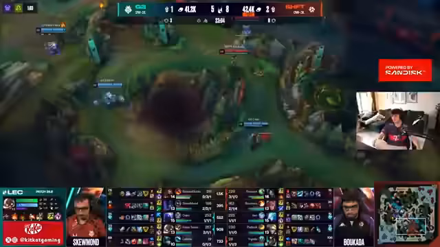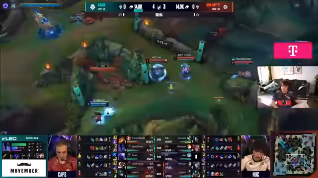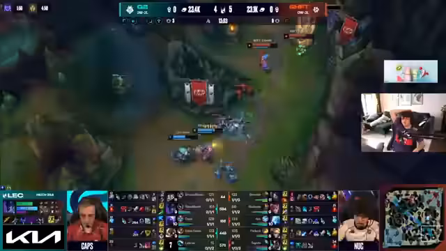 05:23:16Das Spiel verläuft wie erwartet mit einer leichten Führung für MKOI in der Toplane durch Jace und für TH in der Botlane durch Nara. Es gibt ein bis zwei Kills durch Pantheon, die alles um Lott drehen. Shifters zeigt gute Teamkommunikation, ist aber aktuell nicht in der besten Verfassung. Bokada ist weit hinterher, was die Situation für sein Team erschwert. G2 zeigt sich in der Regular Season anders als in den Playoffs, was eine interessante Entwicklung darstellt.