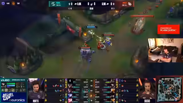 07:04:13Mit einer neuen Draft-Konstellation startet SK Gaming in das dritte Spiel. Die Wahl von Amumu und Diana deutet auf einen aggressiven Early-Game Plan hin, während die Gegner auf Korki und Nami setzen. Die Anfangsphase ist entscheidend, und Mika's Performance als Amumu wird kritisch beobachtet. Die Bot-Lane kämpft mit dem Verlust der Wave- und XP-Vorteile, während die Top-Lane durch Diana's Eingreifen den Vorteil sichert.