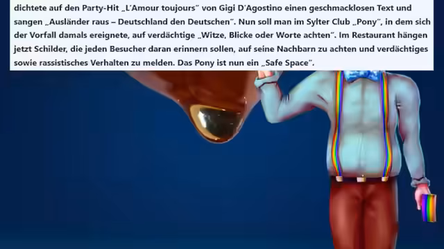 01:27:29Es wird über Alltagsrassismus gesprochen, der von Weißen ausgehe, auch wenn sie sich dessen nicht bewusst seien. Es wird kritisiert, dass währenddessen Kinder an Schulen gequält werden, weil sie Deutsche sind, Frauen vor Züge geworfen werden und die Sexualkriminalität sich verdreifacht habe. Ein Video aus dem Mai 2024, in dem junge Erwachsene einen geschmacklosen Text auf den Partyhit Lamour to Jour dichteten, wird als Zeichen des Widerstandes gegen eine geisteskranke Agenda gesehen. Es wird kritisiert, dass man noch buckeln solle, während man disproportional misshandelt werde, nachdem die Heimat an Millionen kulturfremde Migranten verschenkt wurde. Im Sylter Club Pony soll nun auf verdächtige Witze, Blicke oder Worte geachtet werden. Schilder erinnern Besucher daran, auf ihre Nachbarn zu achten und verdächtiges sowie rassistisches Verhalten zu melden. Das Pony wird als Safe Space deklariert, in dem man ernst genommen wird, ohne Bewertung oder Druck.