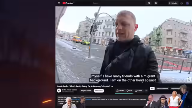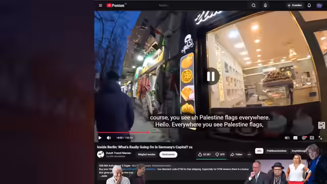 00:33:28Der Streamer beginnt eine Reportage in Berlin. Er kontrastiert die negative Berichterstattung über die Stadt mit eigenen Eindrücken. Einleitend zeigt er eine Schlagzeile über eine massive Stromauslage in Berlin, die vermutlich von linksextremen Aktivisten verursacht wurde. Er filmt Obdachliche und spricht mit Passanten, die großteils aus dem Ausland stammen, und zeigt den kulturellen Wandel der Stadtviertel. Immer wieder werden Palästina-Flaggen gezeigt, hingegen kaum deutsche Flaggen.