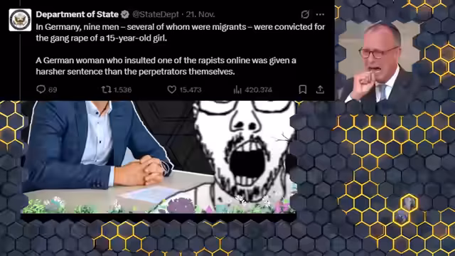 01:27:10Das US-Außenministerium hat auf Twitter eine interessante Meldung veröffentlicht, die als Handlungsaufforderung an Deutschland und andere westliche Länder interpretiert wird. Es wird berichtet, dass die Massenmigration eine existenzielle Bedrohung für die westliche Zivilisation darstellt und die Stabilität wichtiger amerikanischer Verbündeter untergräbt. Das US-Außenministerium hat seine Botschaften angewiesen, über die Auswirkungen der Massenmigration auf Menschenrechte und öffentliche Sicherheit zu berichten. Zudem sollen Maßnahmen dokumentiert werden, die Bürger bestrafen, die sich gegen Massenmigration aussprechen, sowie von Migranten begangene Verbrechen und Menschenrechtsverletzungen. Es werden Beispiele aus Großbritannien, Schweden und Deutschland genannt, wo Migrantenkriminalität und die Bevorzugung von Migranten auf Kosten der eigenen Bürger zu Problemen führten. Insbesondere der Fall einer deutschen Frau, die wegen Beleidigung von Vergewaltigern härter bestraft wurde als die Täter selbst, wird hervorgehoben. Die USA unterstützen die Souveränität ihrer Verbündeten und rufen Regierungen auf, konstruktiv mit Bürgern in Dialog zu treten, die sich Sorgen um die Massenmigration machen. Die Vereinigten Staaten sind bereit, ihre Verbündeten bei der Lösung der globalen Krise der Massenmigration zu unterstützen, was als 'White Pill' der Woche bezeichnet wird, da es Hoffnung auf eine Unterstützung bei Abschiebungen gibt. Es wird auch das 'Meme-Game' des US-Außenministeriums und der Homeland Security gelobt, die mit ironischen Memes auf die Problematik aufmerksam machen.