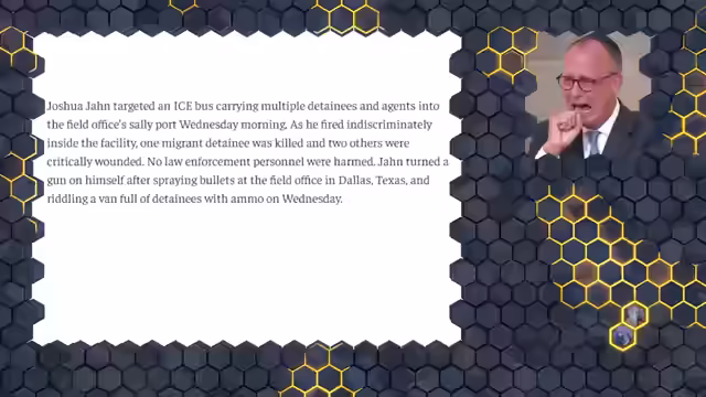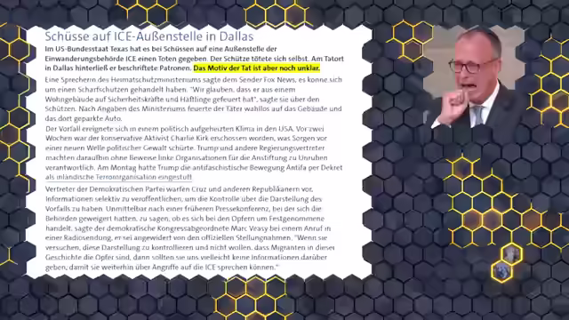 00:32:41Das Hauptthema des Streams ist der Antifa-Terroranschlag auf ein Abschiebezentrum in Dallas. Es wird über eine Serie von Terroranschlägen von Antifa-Seite in den USA berichtet, darunter ein Schusswaffenangriff auf einen Schulgottesdienst in Minneapolis und die Ermordung des republikanischen Aktivisten Charlie Kirk. In Dallas schoss ein 29-jähriger Mann namens Joshua Jan von einem Dach auf ein ICE Detention Facility, wobei er einen Abschiebehäftling aus El Salvador tötete und zwei weitere verletzte. Auf den Patronenhülsen wurden Botschaften wie Anti-Eis gefunden. Der Täter, der sich selbst erschoss, hinterließ einen Zettel, auf dem er seine Motivation beschrieb: Er wollte Eisagenten in Angst und Schrecken versetzen. Seine Familie wird als linksextrem beschrieben, und er hatte eine Vorliebe für Videospiele.