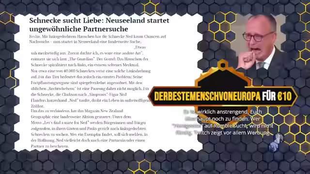 00:08:04In Braunschweig wurde ein Radfahrer von einer Gruppe junger Männer mit südländischem Erscheinungsbild brutal überfallen und verletzt. Am Bahnhof Zoo in Berlin wurde ein Mann bewusstlos getreten, der Täter ist ebenfalls ein Migrant. In Kiel wurde ein 13-Jähriger in einer Jugendunterkunft von mehreren Jugendlichen attackiert und lebensgefährlich verletzt, wobei einer der Täter mit einem Messer auf ihn einstach. Anschließend wird das Land der Woche vorgestellt: Neuseeland, wo eine Schnecke mit linksgedrehtem Haus entdeckt wurde. Die Regierung startete eine Kampagne, um eine passende Partnerin für die Schnecke zu finden, da sie sich nur mit einer anderen linksdrehenden Schnecke paaren kann. Es folgt ein Exkurs über eine Stadtführung in Saarbrücken, die syrische Gastfreundschaft thematisiert, sowie über zusätzliche Feiertage für Muslime in Schleswig-Holstein.