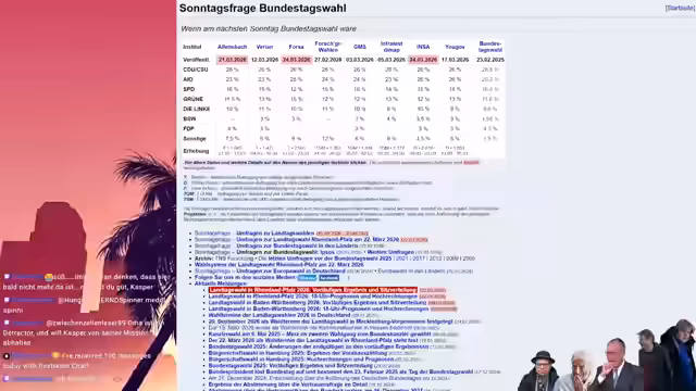 00:05:04Der Streamer wendet sich den aktuellen Sonntags-Umfragewerten für die AfD zu. Er berichtet von einer enttäuschenden Entwicklung, die Partei liege bei nur etwa 26 Prozent und damit deutlich unter früheren Werten, die zeitweise über 30 Prozent lagen. Dies führt zu persönlichen Überlegungen zur Zukunft, basierend auf der Ankunft von Freunden, die aus Deutschland in die Schweiz ziehen. Der Streamer analysiert die Vor- und Nachteile eines Umzugs, berichtet von höheren potenziellen Gehältern in der Schweiz, die aber durch eine erheblich höhere Lebenshaltungskostengegengleichgewichtet werden. Die Entscheidung wird jedoch weniger vom persönlichen Wohlstand als vielmehr von der Sorge um die Zukunft der Kinder und das soziale Umfeld in Deutschland getrieben.