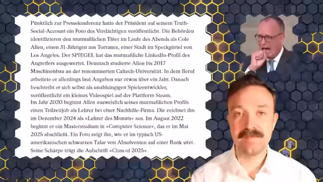 00:00:01Willkommen zur 352. Folge der Honigwabe unter erschwerten Bedingungen, da Kasper krank in China ist. Die Folge beginnt mit einer Analyse des Attentatsversuchs auf Donald Trump beim White House Correspondent Dinner. Ein 31-jähriger Mann namens Cole Allen aus Los Angeles attackierte mit einer Schrotflinte, Pistole und Messern. Der Angreifer wurde nach Schüssen durch Wachposten und dem Eingreifen des Secret Service überwältigt. Auffällig ist sein Hintergrund: Maschinenbau-Absolvent, Indie-Spielentwickler und als Nachhilflehrer des Monats ausgezeichnet. Politisch war er als Unterstützer von Kamala Harris dokumentiert, was Fragen zu seiner Motivation aufwirft.