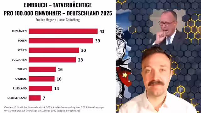 01:37:48Im Stream wird eine ausführliche Analyse der PKS-Statistik vorgenommen, die zeigt, dass bestimmte Nationalitäten wie Rumänen und Polen in Deutschland bei bestimmten Delikten überrepräsentiert sind. So haben pro 100.000 Rumänen 41 Tatverdächtige bei Einbrüchen, während es bei Deutschen nur etwa sieben sind. Dies entspricht einer Überrepresentation von etwa 800 Prozent. Die Analyse zeigt auch, dass sich diese Gruppen auf bestimmte Delikte spezialisiert haben, wobei Rumänen und Polen bei Einbrüchen und räuberischem Diebstahl führend sind.