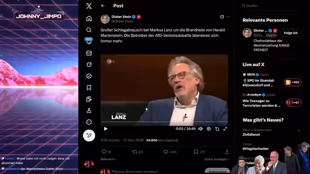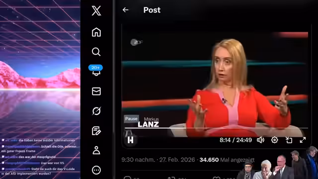 00:17:46Nachdem er sich für kurze Zeit auf einen angekündigten Stream mit Lanz am Wartenstein vorbereitet hat, wendet sich der Streamer politischen Themen zu. Er kritisiert scharf den Intellektuellen Norbert Bolz und AfD-Politiker wie Alice Weidel und Tino Chruppalla für deren außenpolitische Haltung zum Iran. Er argumentiert, dass der Ruf nach einem militärischen Eingriff eine katastrophale Fehleinschätzung sei, da Umfragen eine klare Ablehnung in der Bevölkerung zeigen und das Regime-Change-Szenario am Persischen Golf als unrealistisch und gefährlich einzustufen ist.