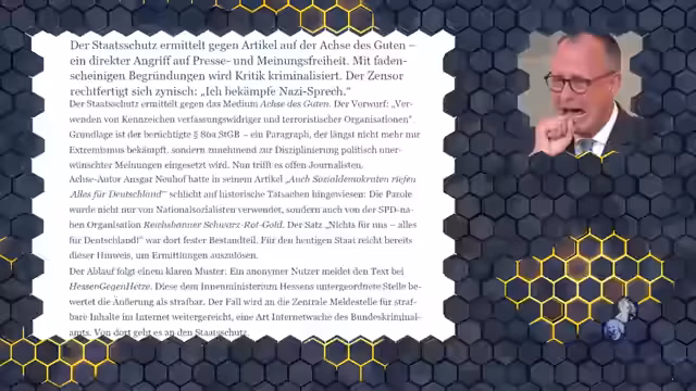 00:25:00Der Staatsschutz ermittelt wegen des Verdachts der Verwendung verfassungsfeindlicher Symbole gegen die 'Achse des Guten'. Der Anlass ist ein Artikel mit dem Titel 'Alles für Deutschland', der von demokratischen und linken Gruppen verwendet wurde. Die Ermittlungen wurden maßgeblich von der Organisation 'Hessen gegen Hetze' initiiert, die vom hessischen Innenministerium finanziert wird und bereits ähnliche Fälle anstoß.
