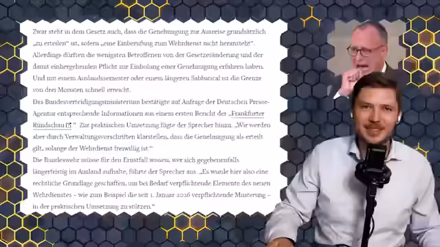 00:00:00Der Stream beginnt mit der Ostergrüßung und der Vorstellung der 349. Folge der Honigwabe. Hauptthemen sind die im Wehrdienstmodernisierungsgesetz geplante Ausreisemeldepflicht für Männer der Bundeswehr und die umstrittene Ankündigung von Friedrich Merz über die Remigration von 80 % der Syrer. Gast Boris von Morgenstern, der Erfahrung mit der Bundeswehr hat, wird in ca. einer halben Stunde erwartet. Ebenfalls angekündigt werden neue Clips über das Lieblings-Power-Pärchen 'Sarah und Achmed'.