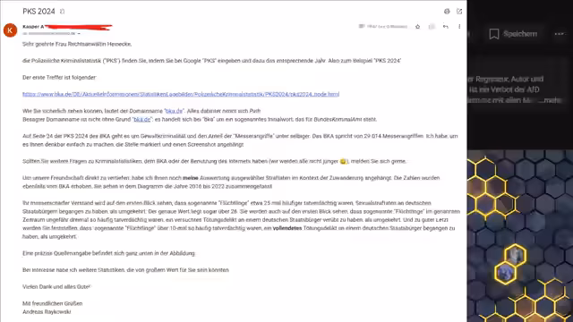 02:20:40Der Streamer berichtet von seiner Konfrontation mit einer Rechtsanwältin, die zuvor im öffentlichen Raum Falschinformationen zur Kriminalstatistik verbreitet hatte. Er schickte ihr eine E-Mail mit präzisen Daten aus der polizeilichen Kriminalstatistik (PKS) des Bundeskriminalamts (BKA), um ihre Behauptungen zu widerlegen. Konkret wies er auf die Zahl von 29.014 Messerangriffen im Jahr 2024 und auf eine eigene Auswertung von Straftaten im Kontext der Zuwanderung hin, die signifikante Unterschiede im Tatverdacht zeigt. Zwar räumte die Anwältin einen Fehler ein, verteidigte ihre Position aber mit dem typischen linken Narrativ, ohne auf die nackten Zahlen einzugehen. Der Streamer sieht darin einen klaren Sieg für seine Faktenlage.