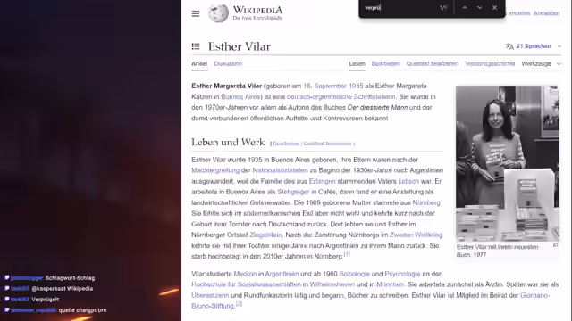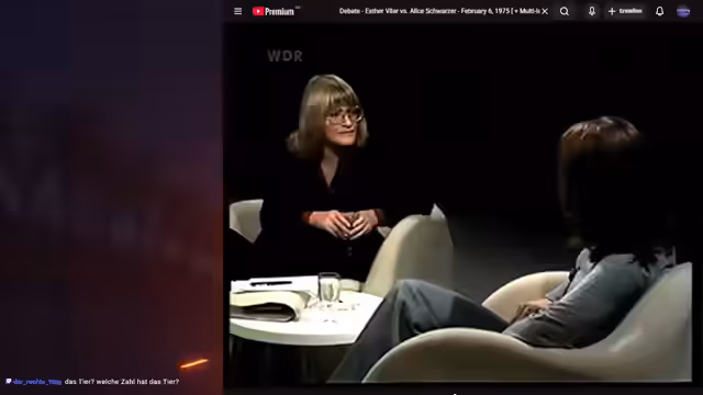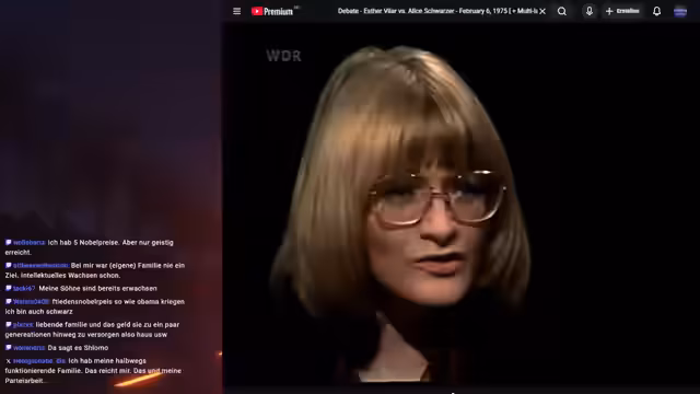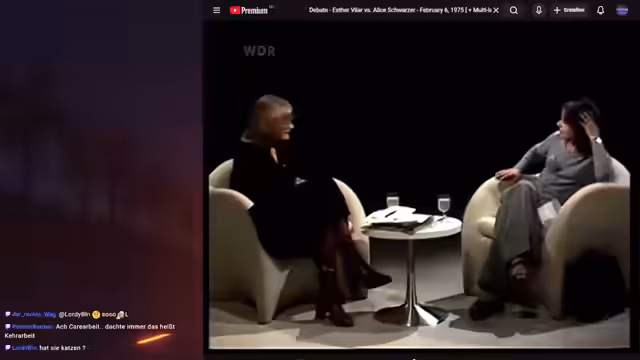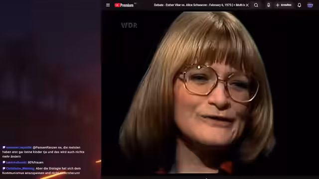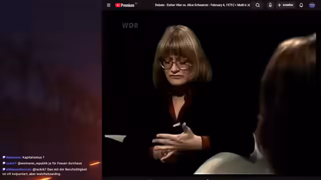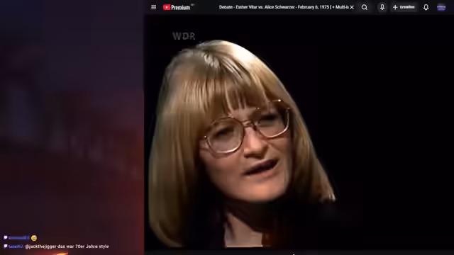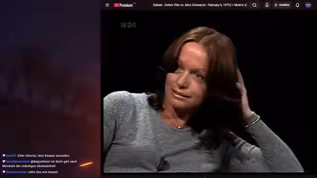 01:22:48Nach einer kurzen technischen Überprüfung der Stream-Verbindung wird eine Umfrage für zukünftige Themen gestartet. Zur Auswahl stehen ein Bericht des Hamburger Zolls über Shisha-Bars und kriminelle Clans, ein Beitrag über „Vulva Watching“ und eine 50 Jahre alte Debatte zwischen Esther Vilar und Alice Schwarzer. Die Debatte zwischen Vilar und Schwarzer gewinnt die Umfrage deutlich. Bevor diese Debatte gestartet wird, wird kurz auf eine Auseinandersetzung zwischen Esther Vilar und der Interviewerin eingegangen, die als „extremst dominant“ beschrieben wird. Es wird eine Parallele zu einem Interview mit Sidney Sweeney gezogen, bei dem die Interviewerin versuchte, Sweeney zu einer Distanzierung von „White Supremacism“ zu drängen. Sweeney weigerte sich, sich in diesen Frame drängen zu lassen, was als „Verliererstrategie“ abgetan wird. Die Debatte zwischen Vilar und Schwarzer beginnt mit der Frage, ob Vilars Schriften Satire oder ernst gemeint sind. Vilar bekräftigt, dass es ihr ernst ist und sie keine heimliche Feministin sei, sondern eine „offene Feministin“, die einen „weiblichen Feminismus“ vertritt, im Gegensatz zum „männlichen Feminismus“ der orthodoxen Feministinnen. Sie kritisiert, dass der Wert einer Frau heutzutage oft über ihren beruflichen Erfolg in männlichen Domänen definiert werde, was als zeitlos und zutreffend empfunden wird.