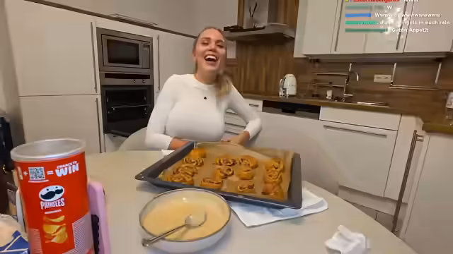 02:18:32Die Streamerinnen Amalia und Julia sowie Kony sind weiterhin mit dem Backen der Zimtschnecken beschäftigt. Während die Zimtschnecken im Ofen sind und einen verlockenden Duft verbreiten, diskutieren sie humorvoll über den Bräunungsgrad und die Konsistenz. Kony äußert den Wunsch, auf Toilette zu gehen, was Julia mit einem Augenzwinkern kommentiert. Es wird über die Zubereitung des Frostings gesprochen, und Kony wird aufgefordert, seine „Signaturen“ nicht zu vergessen. Die Stimmung ist locker und von Scherzen geprägt, während die Vorfreude auf das fertige Gebäck steigt. Amalia erwähnt, dass sie noch nicht fertig ist, und Kony fordert sie auf, zu essen, da sie noch eine „Chips-Challenge“ vor sich hat. Die Interaktion zwischen den dreien bleibt spielerisch und unterhaltsam.