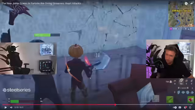02:28:21Die Server sind wieder online und der Streamer startet ins Battle Royale. Er landet direkt in einer der neuen halloween-inspirierten Städte namens Freaky Fields und erkundet diese. Es werden die ersten neuen Items wie die Kürbiskiste und die Säge gesichtet. Besonders erwähnt wird die Rückkehr des Jason-Boss-Charakters, der viele Leben hat und als Bedrohung wahrgenommen wird.