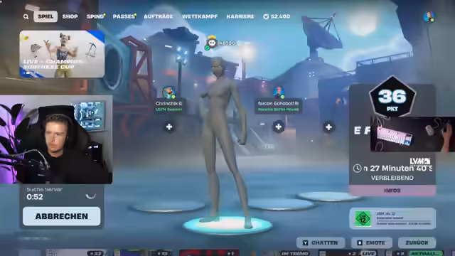 08:15:32Im Rahmen des FNCS Surfhexe Cups muss der Streamer innerhalb einer Stunde bestimmte Punkte erreichen, um den Skin zu gewinnen. Nach einem Game-Crash und Netzwerkproblemen in den vorherigen Runden ist er unter Druck und muss in den verbleibenden Runden alles geben, um sein Ziel zu erreichen.