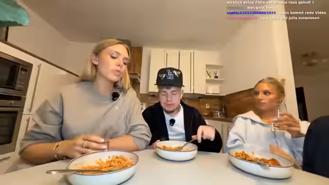 02:13:28Zu Beginn des Streamabschnitts geht es um die Zubereitung einer gemeinsamen Nudelgericht. Die Streamerin beschreibt das Kochen der Nudeln, wobei sie viel Salz hinzufügt, um den Geschmack zu intensivieren. Parallel wird in einer Pfanne Olivenöl erhitzt, um Tomatenmark anzubraten und Röstaromen zu entwickeln. Währenddessen wird mehrfach erwähnt, dass die drei Anwesenden zu Mitt essen. Der Prozess gestaltet sich jedoch chaotisch, da das Wasser überkocht und die Abzugshaube nicht funktioniert.