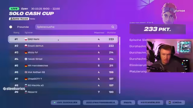 10:30:06Der Solo Cash Cup geht zu Ende. Der Streamer präsentiert die finalen Platzierungen und Preisgelder. FischiX gewinnt den Cup und erhält 8.000 Dollar. Deutsche Spieler wie Cep und Pixi erreichen ebenfalls hohe Plätze und gewinnen deutlich Preisgelder. Der Streamer gratuliert den Gewinnern und erwähnt positive Ergebnisse von deutschen Teilnehmern wie Taichi, der sich im Ranking verbessern konnte.