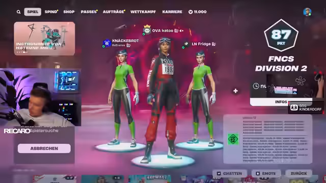 00:27:02Der Streamer bereitet sich auf die FNCS Division 2 Middle East vor, muss aber aufgrund der Abwesenheit von Arnes ein Duo spielen. Er äußert seinen Unmut über Arnes' Abwesenheit und dessen mangelnden Respekt. Es wird über die verbleibenden Chancen in der FNCS diskutiert, wobei noch eine Woche verbleibt. Der Streamer scherzt darüber, dass Arnes sich krankmelden solle, um spielen zu können. Es wird über die Anzahl der Spieler in Middle East Division 2 gesprochen, wobei es machbar erscheint, unter die Top 10 zu kommen. Der Streamer landet mit seinem Team in Mass Manor, obwohl er eigentlich Wifi Wav bevorzugt hätte. Es wird über die Notwendigkeit einer Jobmap diskutiert. Der Streamer und sein Team werden von anderen Spielern angegriffen, können sich aber verteidigen.