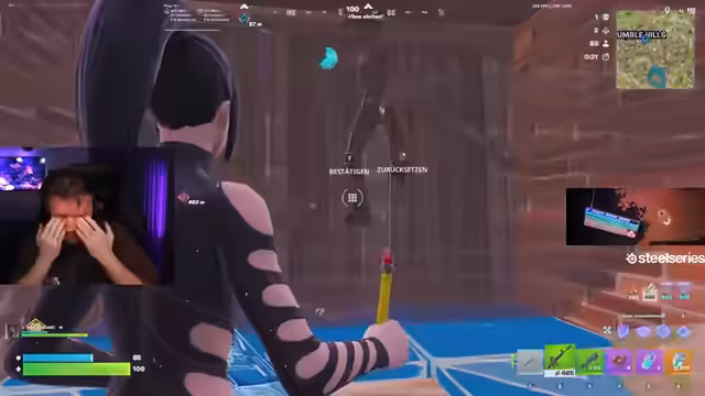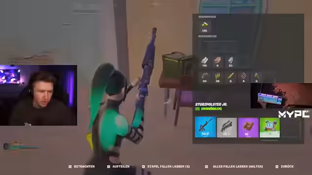 02:54:30Der Stream beginnt mit einer Runde, in der der Spieler einen Jetpack erwähnt und kurz pausiert. Es findet ein Early-Game-Loot statt, wobei Ressourcen wie Metal, Brick und Holz gesammelt werden. Der Spieler gibt seinem Teammate Ressourcen wie eine blaue MP-HR und Crashpads. Das Ziel sind drei saubere Gamesets. Die Lobby wird als schwierig beschrieben, da immer die gleichen Gegner auftauchen, unabhängig von der Elo.