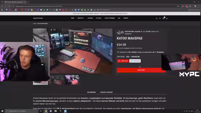 00:09:14Der Streamer geht auf alle Details des Mauspad-Verkaufs ein. Es gibt zwei Größen: ein kleines Mauspad (90x40 cm) für 35 Euro und ein großes Mauspad für 49,99 Euro, jeweils zzgl. Versand. Die Mauspads werden von Argonpads produziert und sind als Speed-Mauspad mit wasserabweisender Oberfläche konzipiert, was sie besonders für Fortnite-Spieler geeignet macht. Jeder Käufer erhält eine exklusive, unterschriebene Autogrammkarte. Der Verkauf startet um 14 Uhr und der Link wird im Chat und in der Bio gepostet.