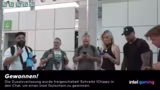 02:53:00Am Ende erreichen die Teilnehmer den Startpunkt vor dem gegnerischen Team und gewinnen die Challenge. Sie werden mit Beifall und Konfetti empfangen. Nun folgt die Verlosung von Preisen, darunter ein 60 Euro Intel Gutschein, den sie im Chat mit Ausrufezeichen 'Chippy' gewinnen können. Auch der gesammelte Rucksack mit verschiedenen Preisen wird unter den Zuschauern verlost.
