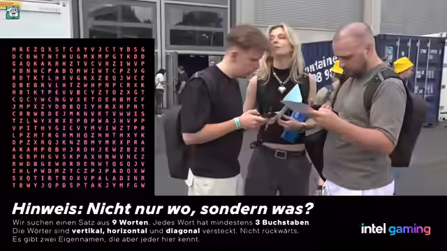 01:25:13Bei der Intel Gamescom Challenge müssen die Teilnehmer verschiedene Rätsel lösen und Herausforderungen meistern. Es geht um das Finden versteckter Chibis und das Lösen von Coden, die Hinweise auf den Aufenthaltsort der nächsten Station geben. Die Teilnehmer müssen dabei durch verschiedene Hallen der Messe eilen und mit Hilfe des Chats und ihrer eigenen Kreativität weiterkommen.