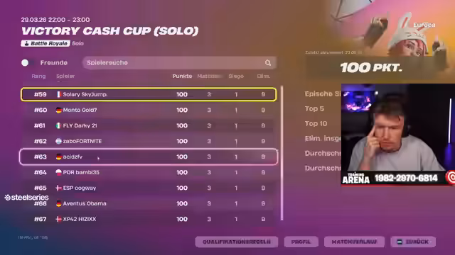 08:43:57Der Streamer beginnt mit der Übertragung der Finalrunden des Solo-Victory-Cash-Cups. Er weist darauf hin, dass jeder Sieg 100 Dollar Earnings bringt und bittet die Zuschauer um Vorhersagen, wie viele Wins sie im Stream sehen werden. Der Fokus liegt auf der Live-Überwachung mehrerer deutscher und internationaler Spieler wie Vico, Schmali, Prism und Reason, um deren Leistung zu analysieren und deren Earnings-Pfade zu verfolgen.