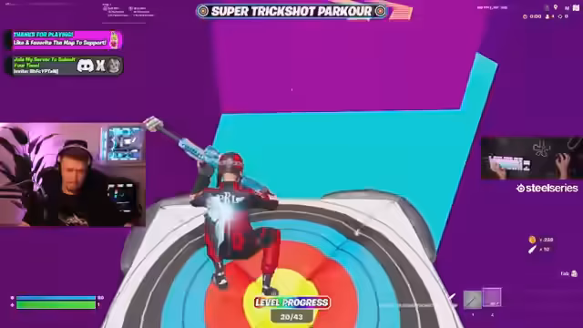 01:23:30Abschließend starten die Streamer ein gemeinsames Minispiel auf einer von einem Creator gebauten Trickshot-Parcours-Map. Der Code wird geteilt und alle Spieler versuchen nacheinander, die immer schwieriger werdenden Level mit der Sniper zu meistern. Der Streamer zeigt sich dabei sehr frustriert über seine eigene mangelnde Geschicklichkeit und vergleicht sich negativ mit den anderen Teilnehmern, die zügiger vorankommen. Das Spiel endet, als der Streamer bei Level 23 aufgibt.