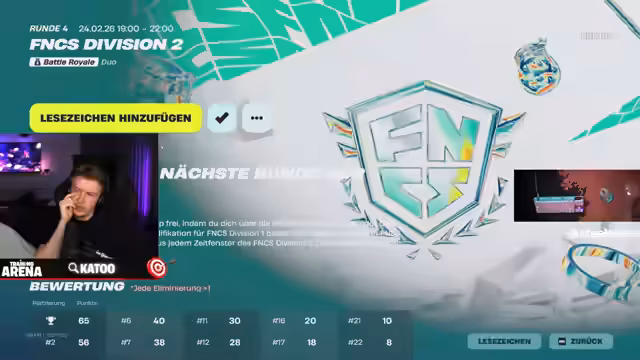 00:01:33Zu Beginn des Streams begrüßt der Streamer, Kevin, seinen Chat und tauscht sich mit den Zuschauern über den vergangenen Montag und den aktuellen Tag aus. Er geht auf verschiedene Spenden und Bits ein, erwähnt seine Division 2 im Fortnite Competitive und beginnt mit allgemeinen Smalltalk. Auch die Ankündigung, dass man sich in der Training Arena auf den FNCS Cup vorbereiten wird, fällt in diesen frühen Abschnitt. Der Fokus liegt auf der Aufwärmsphase und der Interaktion mit der Community.