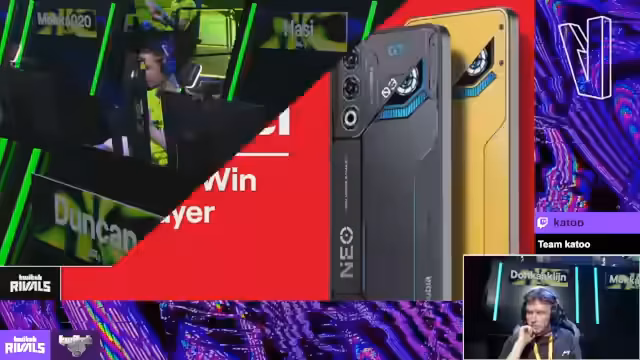 00:54:24Das zweite Spiel beginnt mit einer geänderten Taktik. Während der Streamer eine sichere Rolle übernimmt, spielt sein Teamkollege aggressiv. Ziel ist es, Eliminierungen zu erzwingen, sobald ein Gegner in Reichweite ist. Trotz des aggressiven Vorgehens gelingt es dem Team, früh Loot zu sichern, darunter Schildblasen, Impulsgranaten und Grapple-Haken. Das Team koordiniert seine Angriffe und nutzt die Kartenstruktur, um aus dem Hinterhalt zu agieren und Gegner zu überraschen.