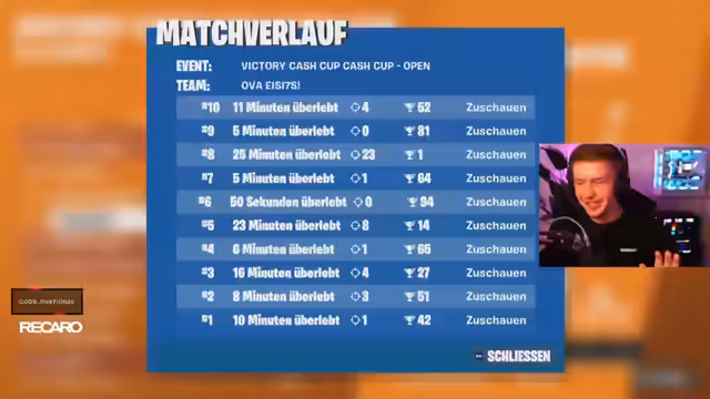 01:53:21Der Streamer analysiert die Punktesituation und die verbleibende Zeit. Sein Ziel ist ein Platzierung im Top 5 und ein Kill-Win, um die Punkte für den Cash Cup zu sichern. Es werden strategische Optionen wie das Angeln in Lobbys oder die Platzierung von Bunkern besprochen, während der Coach die Stärke des Spielers betont und die Notwendigkeit, Fehler zu vermeiden, um das knapp verlorene Endgame nicht wiederholen zu müssen.