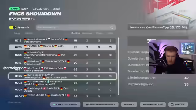05:25:11Der Streamer startet die angekündigte Viewing Party für den FNCS Showdown. Er erklärt, dass es sich hierbei um einen Trio-Cash-Cup handelt, bei dem der erste Platz 9000 Dollar gewinnt und die Profis sich qualifizieren müssen, indem sie heute unter die Top 33 kommen. Die Atmosphäre ist aufgeregt und der Streamer fordert die Zuschauer auf, ein Abo und ein Like zu hinterlassen, um mehr solcher Events zu fördern.