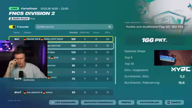 00:41:56Der FNCS Division Cup beginnt. Der Streamer und sein Team spielen auf hohem Niveau und konzentrieren sich darauf, kontrolliert späte Spielphasen zu managen. Während des Streams kritisiert der Streamer, dass viele Gegner riskant und unkontrolliert spielen, was er als ineffektiv ansieht. Trotz guter Leistung und einem Kill in einer Runde haben sie Mühe, die nötigen Punkte zu sammeln, was den Aufstieg in Division 1 erschwert.