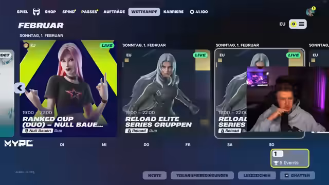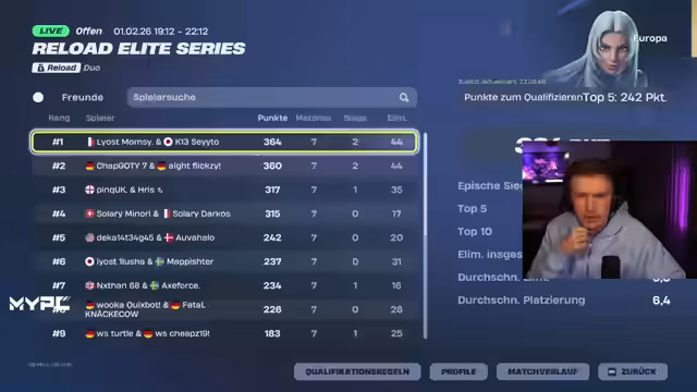 00:01:02Der Stream beginnt mit einer Begrüßung und dem Plan für den Tag. Es sind Solo-Customs für 13 Uhr, das Finale des Playstation Cup um 15 Uhr und die Elite Series Heats um 19 Uhr angesetzt. Der Streamer berichtet über das gestrige FNCS Trials-Erlebnis, bei dem er und viele bekannte Spieler wie Max, Vioxx und Jaddy die Qualifikation für Division 2 verpassten und nun in Division 3 starten. Das Ziel ist es, in den kommenden Tagen direkt in Division 1 aufzusteigen.