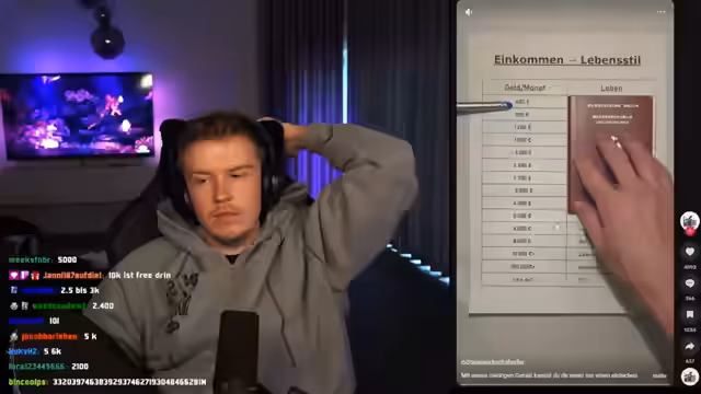 02:30:35Ein Zuschauer bringt eine Liste mit Einkommensstufen und dem dazugehörigen Lebensstandard ein, die von 600 Euro (Überleben) bis über 100.000 Euro (Investorenwelt) reicht. Der Streamer und die Community diskutieren, wo sie sich einordnen und was realistisch für die Zukunft wäre. Viele schätzen sich zwischen 3.000 und 5.000 Euro Nettoeinkommen als ideal ein, was einen entspannten Alltag ermöglicht. Es folgt eine humorvolle Auseinandersetzung über weibliche Partner und deren Fähigkeiten, wie Kochen, was für Unterhaltung sorgt, während das Thema abgeschlossen wird, um zurück zu den Heats zu gehen.