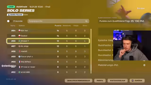 08:07:30Im Mittelpunkt steht die Verfolgung von Spielen während des Solo-Series-Heat-3/4. Der Streamer analysiert das Verhalten von Pros wie Amos und Prax, diskutiert Rotationen, Surge-Nutzung und die Wichtigkeit von Zonen. Es werden spezifische Strategieschwächen hervorgehoben, z. B. fehlende Metalle oder ungünstige Sprüge. Die Evaluation umfasst auch die Standings und die Punkteverteilung, wobei der Commentar auf die Wettkampfdynamik eingeht, ohne auf Abos oder Sub-Gifts zu reagieren.