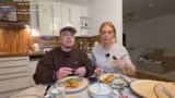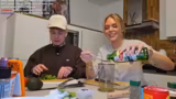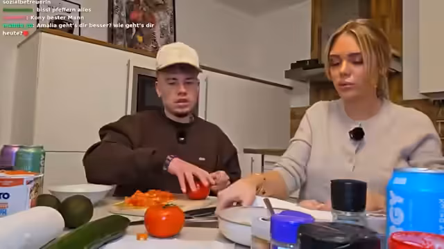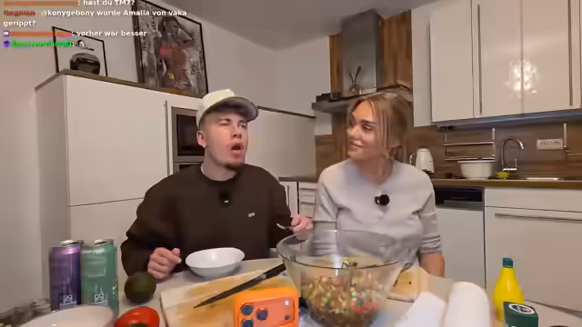 01:59:09Die Streamer versuchen, die Community stärker in den Stream einzubinden. So rufen sie Julia an, die sich schlafen gehen wollte, und laden sie spontan zum gemeinsamen Essen ein. Sie zeigen den Zuschauern die Zutaten für den Salat und erwähnen, dass Viktoria, eine Freundin im Chat, ebenfalls gegrüßt werden soll. Die Kommunikation ist herzlich und darauf ausgerichtet, die Zuschauer am Geschehen teilhaben zu lassen.